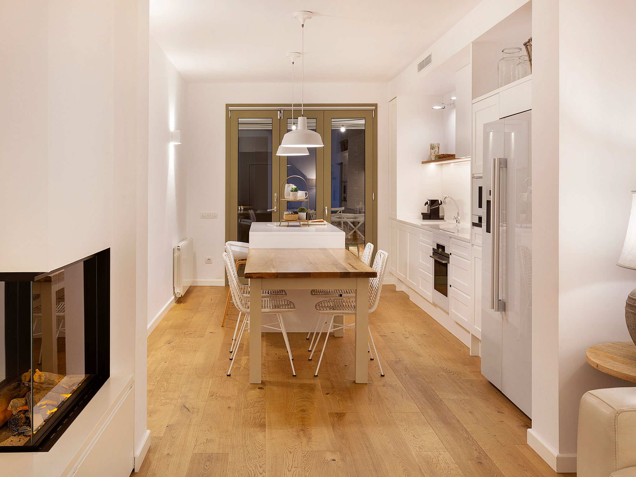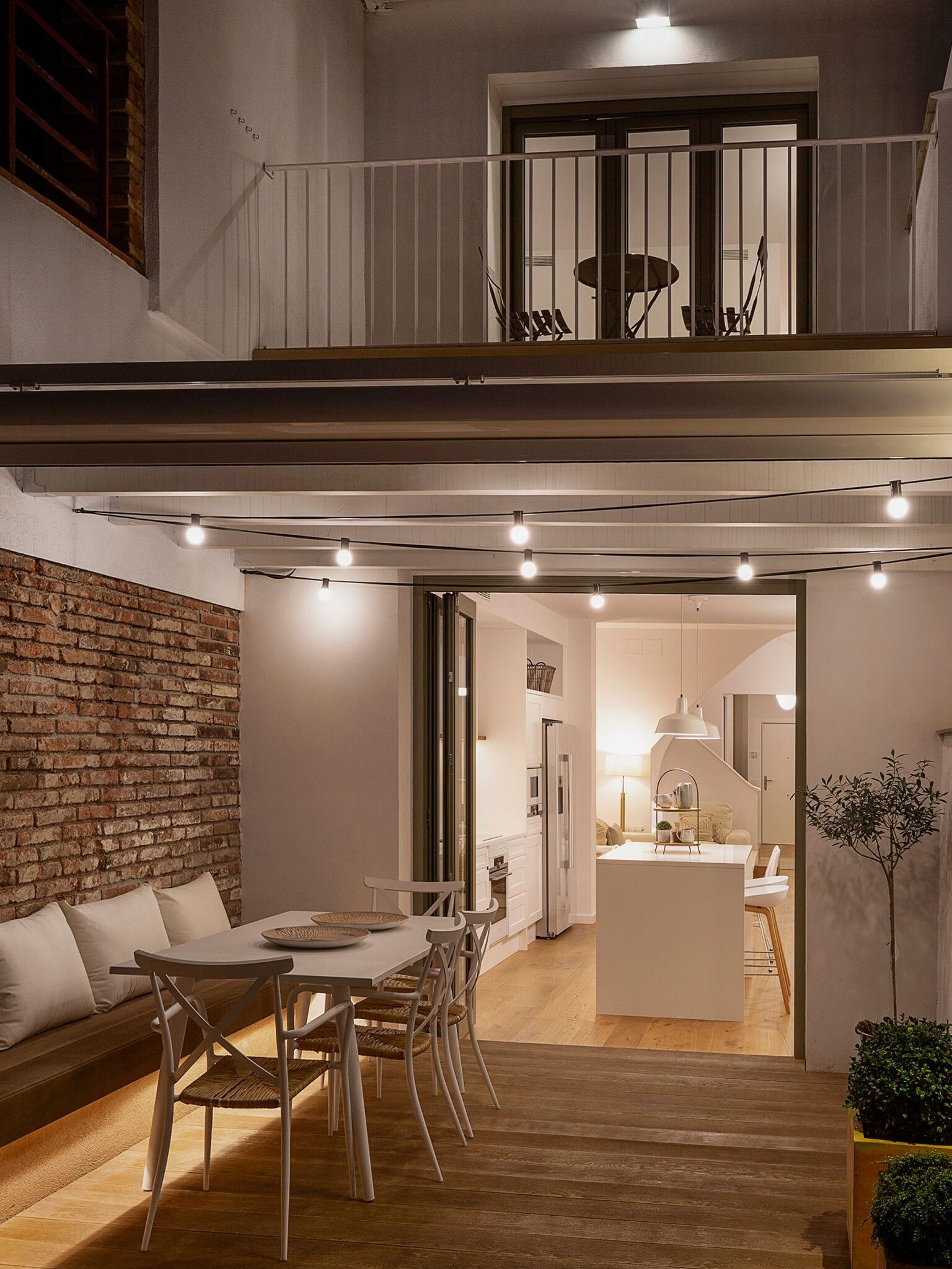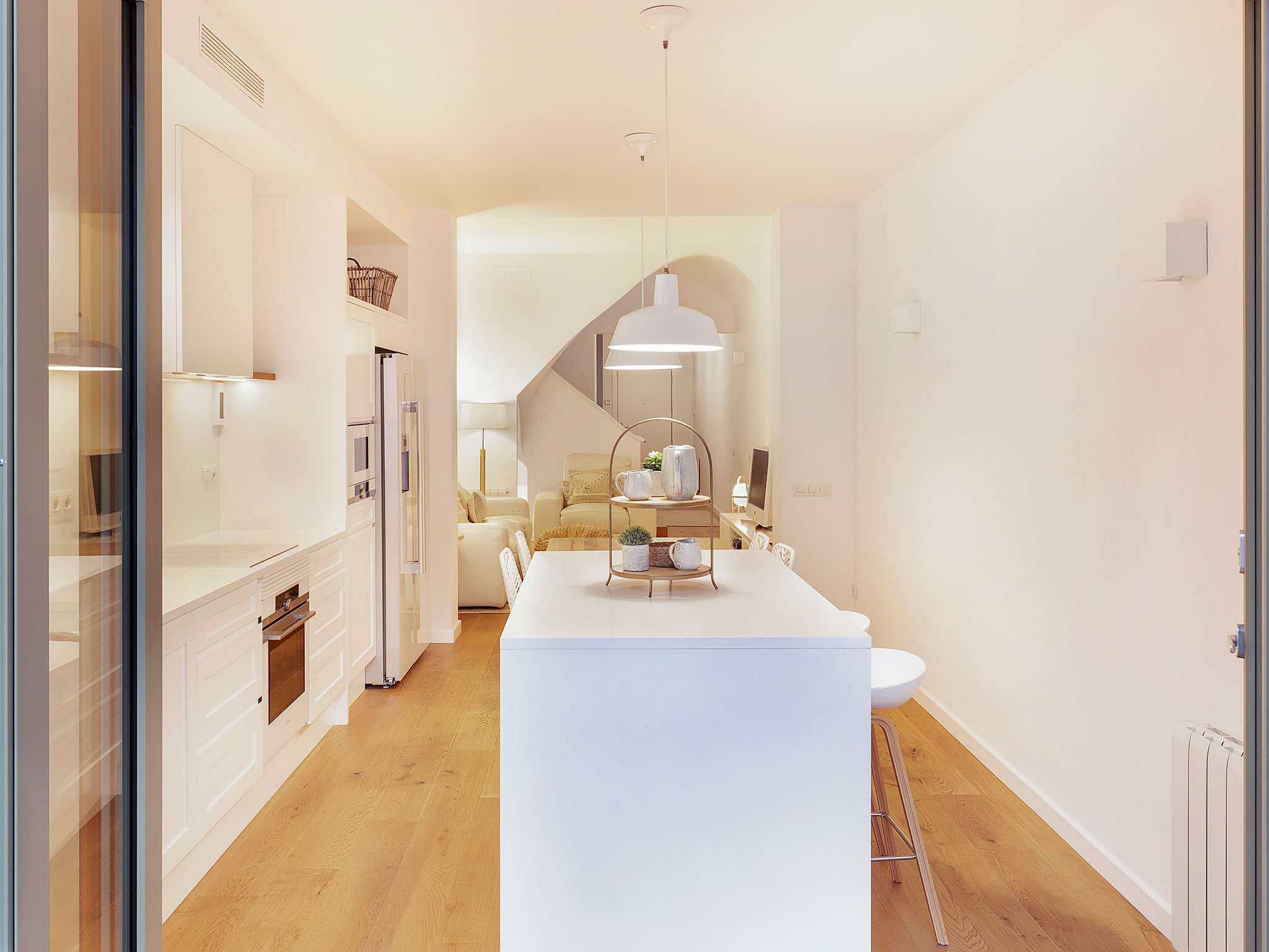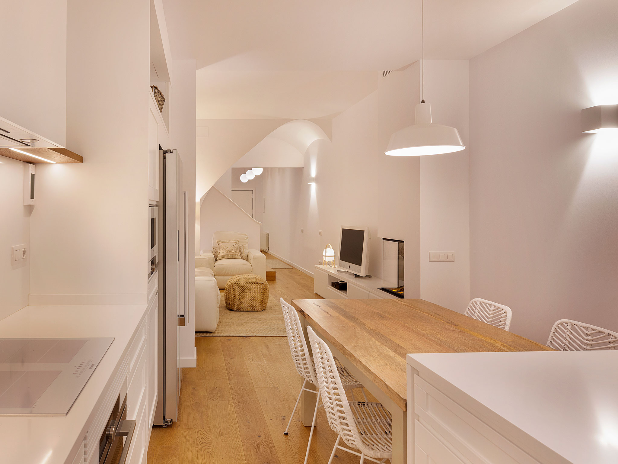 S’acondiciona tota la planta baixa antigament ja destinada a habitatge, amb una distribució diàfana d’un sol espai d’accés-estudi, annex a una sala, que engloba també l’ús de menjador i de cuina. Això sí, al centre de la casa es conserva l’escala interior existent d’accés a la planta primera.
